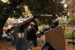 3. 対戦相手に危険が及ばない限りで(転倒を誘発する等)、盾や武器は対戦相手の盾や武器を動かしたり、跳ね返したり、動かなくするために使用できる。また、盾や武器の柄を敵の攻撃や防御を制限するために使用することも許される。