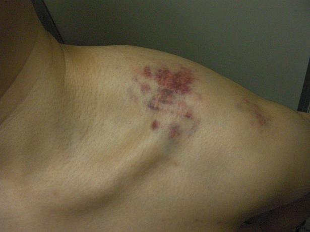 豪快な一撃を喰らって、見事なチェインメイル傷が出来ていたので晒す。